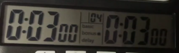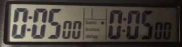 Exibindo 3 min + 2 seg de acréscimo. Para alterar: aperte confirm, navegue com start, altere o acréscimo e confirme novamente. Para iniciar, aperte start. Para restaurar, segure reset.